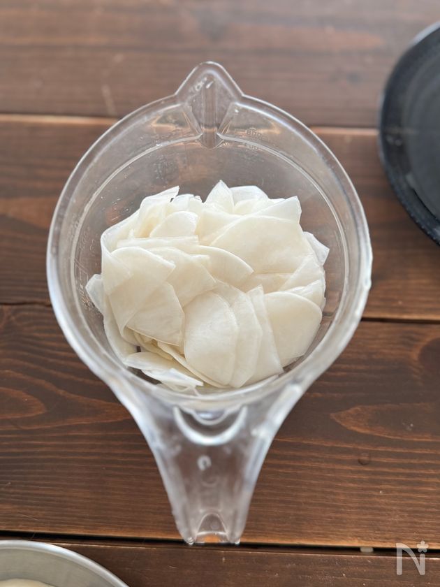 (1) かぶは皮をむき、縦半分に切ってからスライサーで薄切りにする。塩ふたつまみ(分量外)をもみ込み5分ほどおき、水気をしぼる。