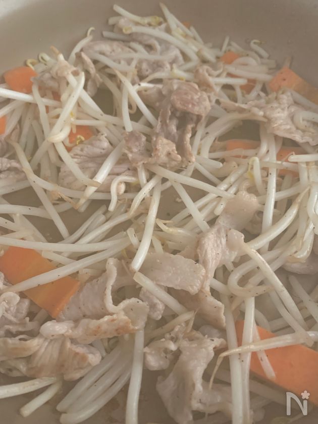 (2) もやしを入れたら塩、胡椒で炒め合わせる。