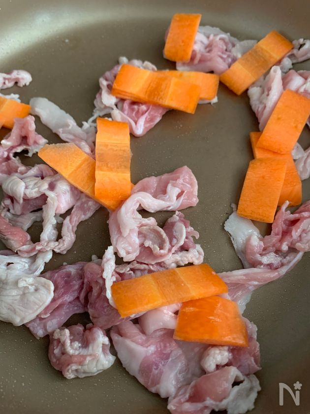 (1) フライパンにサラダ油を入れて火をつけ、豚こま切れ肉を炒める。色が変わってきたら人参も入れて炒める。