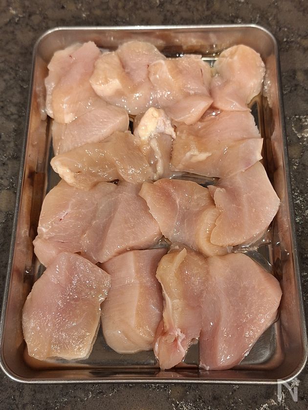 (1) 鶏むね肉はひとくち大のそぎ切りにし、【A】をもみこむ。