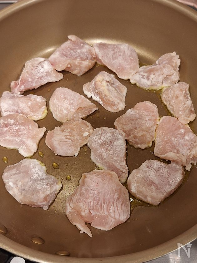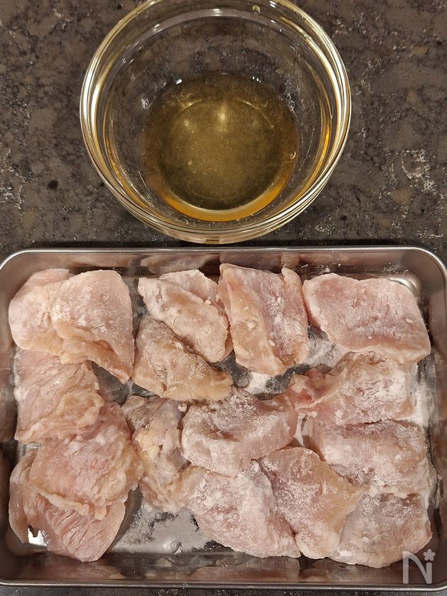 ・鶏むね肉は、塩と白ワインをもみこみ、米粉でコーティングすることでかたくなるのを防ぎます。