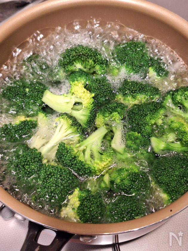 (3) 鍋に【B】を入れて沸かし、ブロッコリーを茎から入れる。