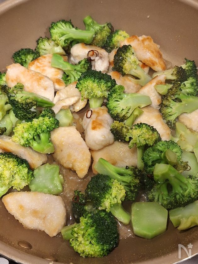 (6) 鶏むね肉に火が通ったらブロッコリーを入れ、レモン汁を合わせた【C】、ガーリックパウダー、たかのつめ(輪切り)を加えて炒め合わせる。