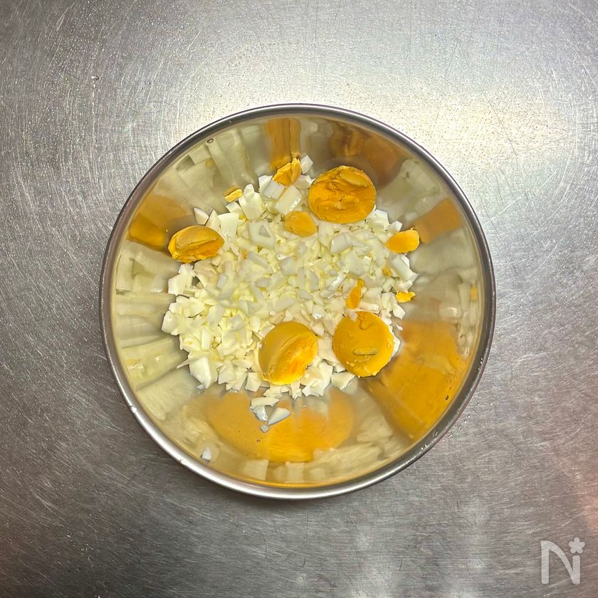 (4) ②の卵はぬるま湯にとり、粗熱がとれたら殻をむいて白身はみじん切りにし、黄身は軽くほぐす。