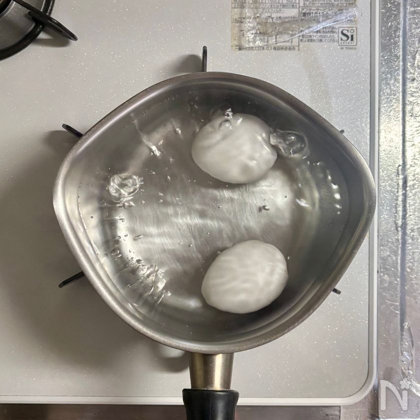 (2) 別の小鍋に湯を沸かし、冷蔵庫から出した卵をそっと入れ、再び沸騰したら弱めの中火で12分ゆでる。