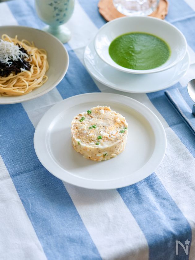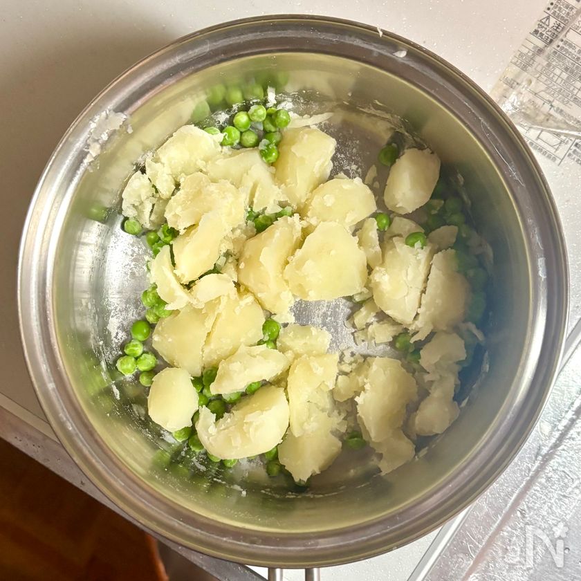 湯を捨ててじゃがいもとグリーンピースを鍋に戻し入れ、再度火にかけて鍋をゆすりながら水分をとばし、木べらなどで粗くつぶす。