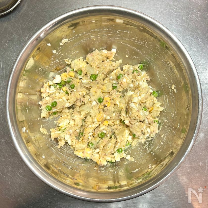 (7) じゃがいもが温かいうちに⑥を⑤のボウルに加えて混ぜ、塩少々(分量外)で味をととのえる。