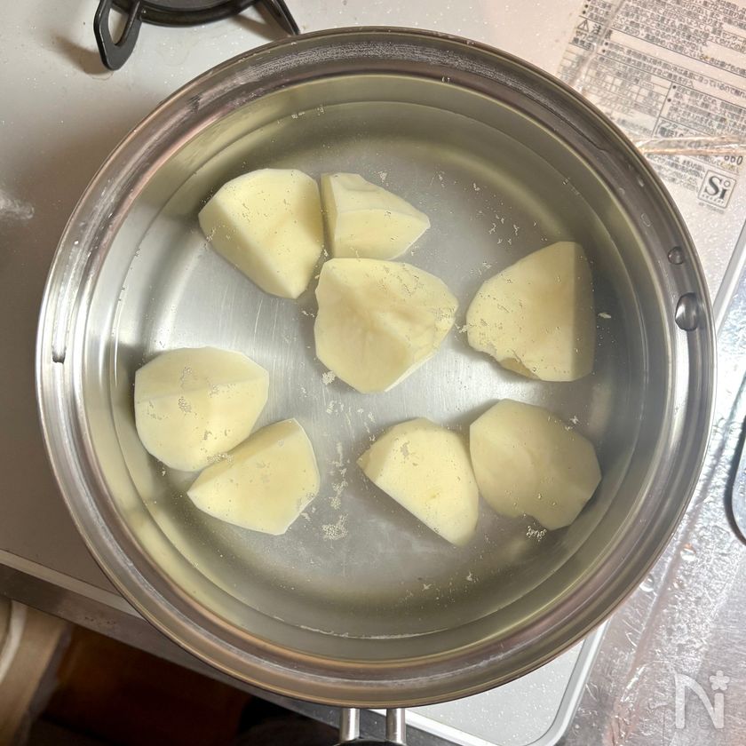 鍋にじゃがいもを入れ、かぶるくらいの水と塩を加えて火にかける。