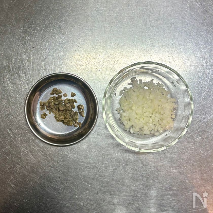 (3) 玉ねぎはみじん切りにし、1分ほど水にさらしてペーパータオルに包んで水気を絞る。