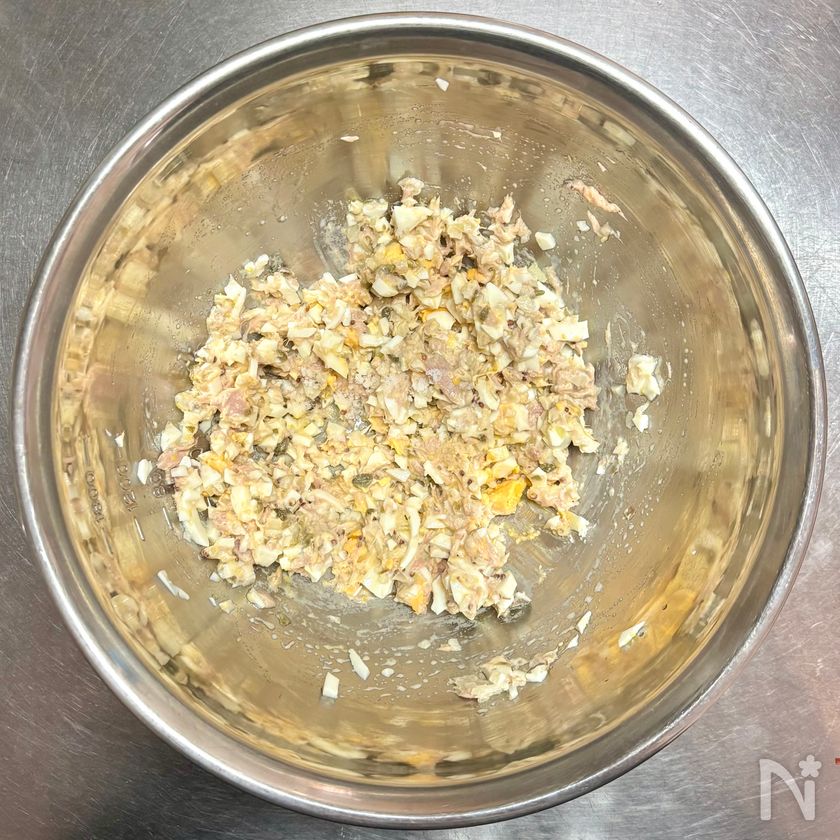 (5) 大きめのボウルにツナを缶汁ごと入れ、③の玉ねぎとケイパー、④のゆで卵、【A】を加えて混ぜる。