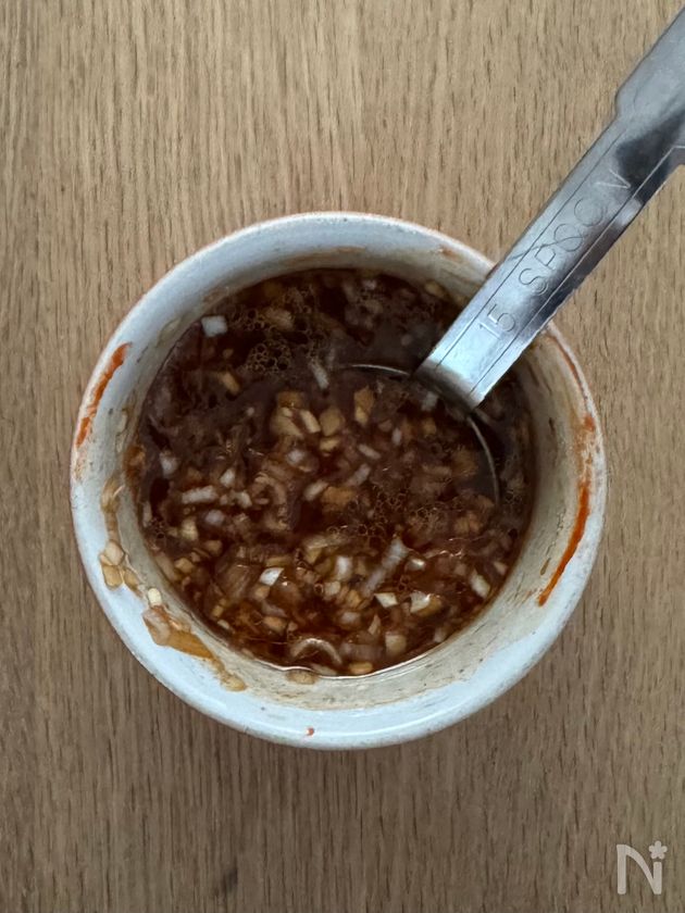 (2) 皿に盛り付け、【A】を適量かける(いっきに全量かけず、お好みで)小ねぎ(小口切り)をふる。