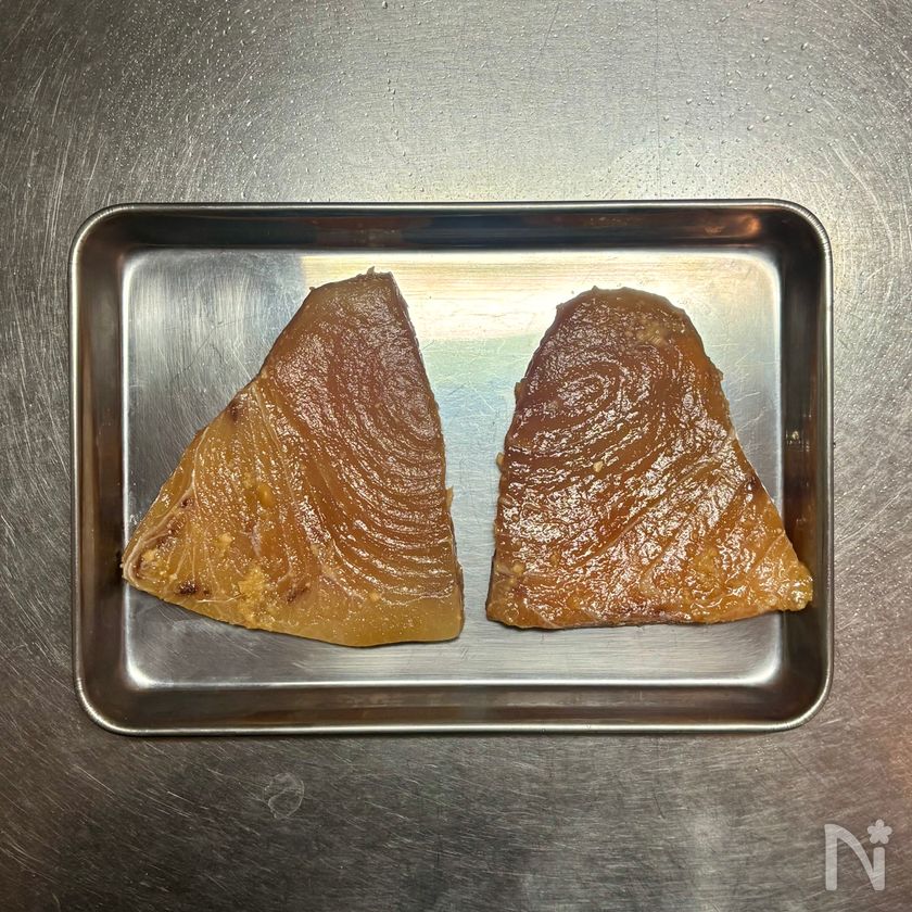 焼く10分ほど前に②のかじきを冷蔵庫から出し、ペーパータオルでみそだれをぬぐい落とす。