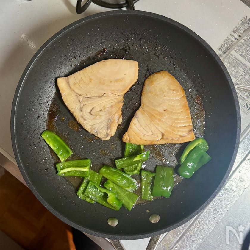 裏返してピーマンを加え、ふたをしてさらに3分ほど焼いてかじきに火を通す(ピーマンは1分30秒ほど焼いたら取り出し、塩をふる)。