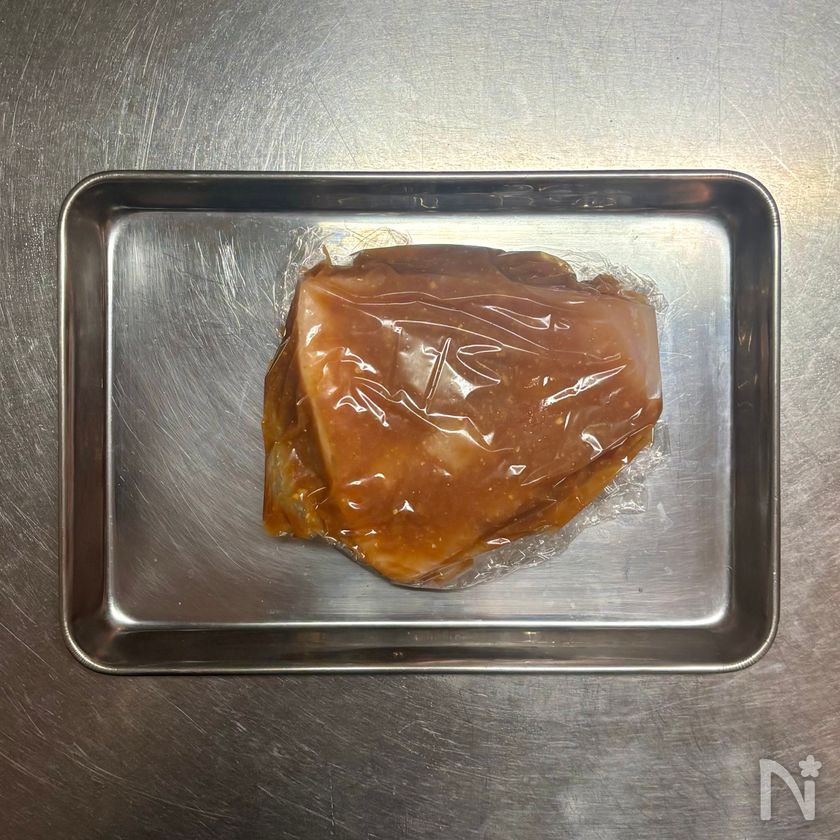 ラップを広げ、①のみそだれの半量を塗ってかじきをのせ、残りのみそだれをかじきに塗る。