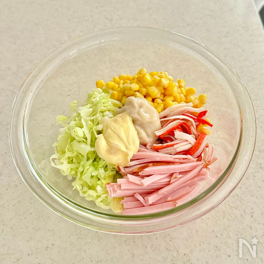 (2) キャベツをザルに入れ、熱湯(500mlほど)を回しかけ、粗熱が取れたら水気を絞ってボウルに入れ、ロースハム、カニかま、コーンと【A】と合わせる。器に盛り付け、お好みで粗挽き黒胡椒をふる。