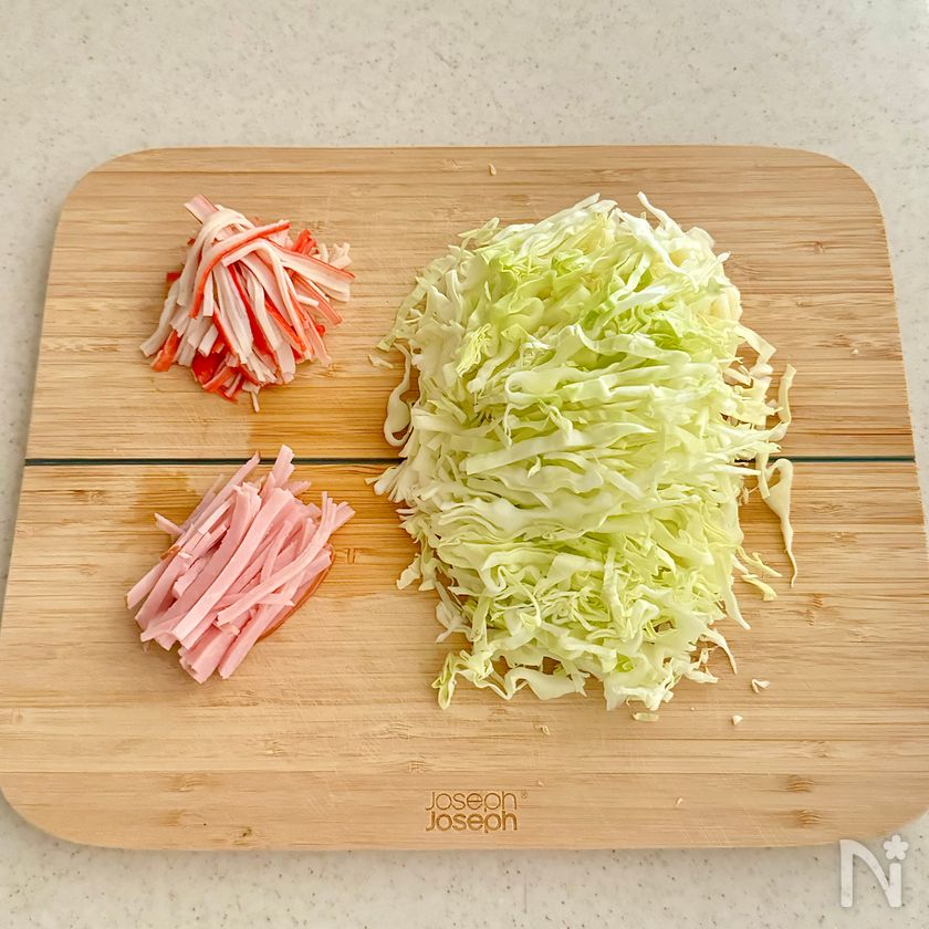 (1) キャベツは太めのせん切りにし、ロースハムは細切りにする。カニかまはほぐす。