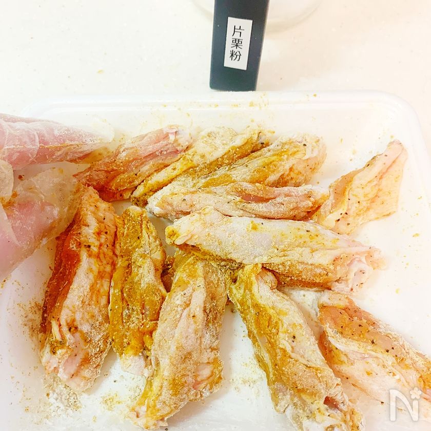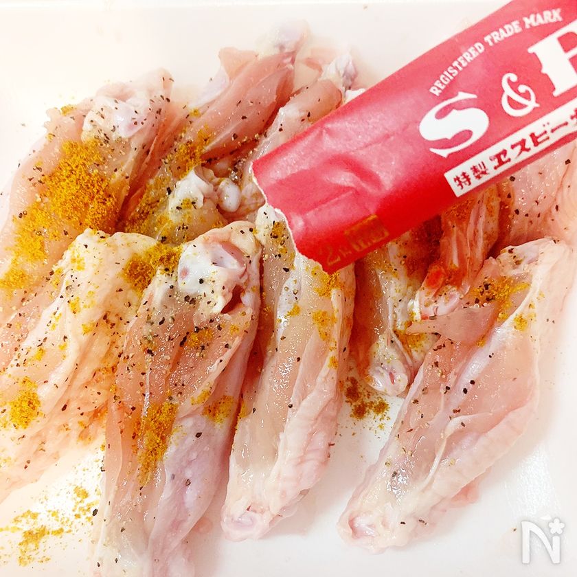 (1) 鶏手羽中に塩、こしょう、おろしにんにく(チューブ)を軽く揉み込む。