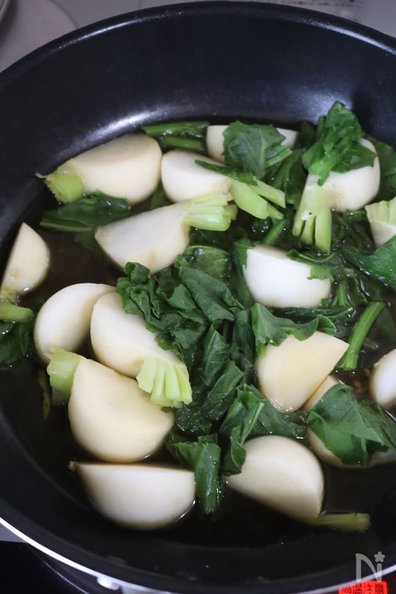 (3) 2にかぶの葉を加えて再びふたをし、さらに3分ほど煮る。