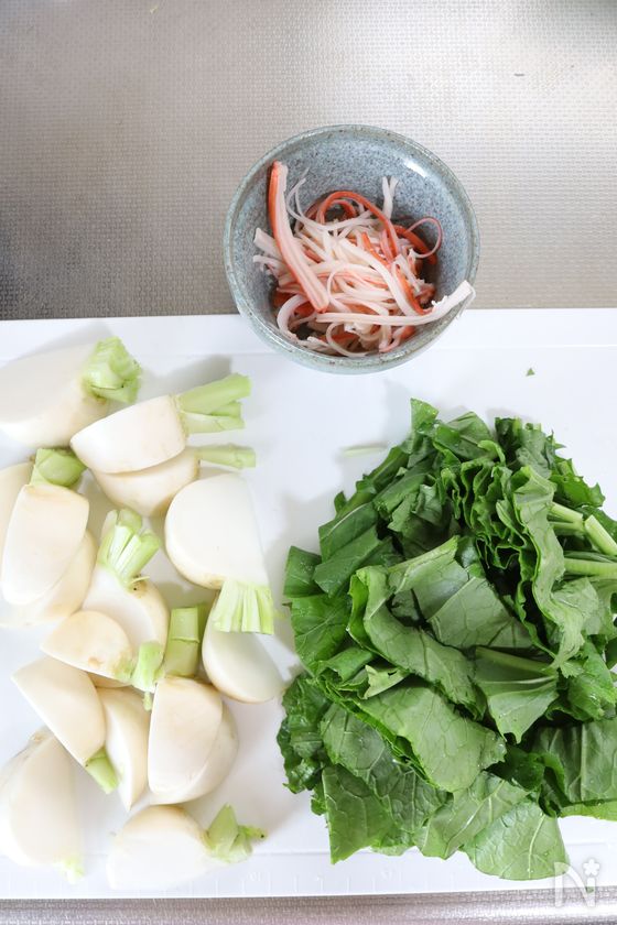 (1) かぶは茎を1cm程残して、1.5cm幅程度のくし形切りにする。かぶの葉は3cm幅程度に切る。