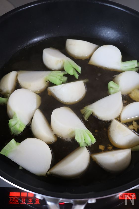 (2) フライパンに【A】とかぶを入れて中火で熱し、沸いてきたらふたをし、弱めの中火で10分ほど蒸し煮する。