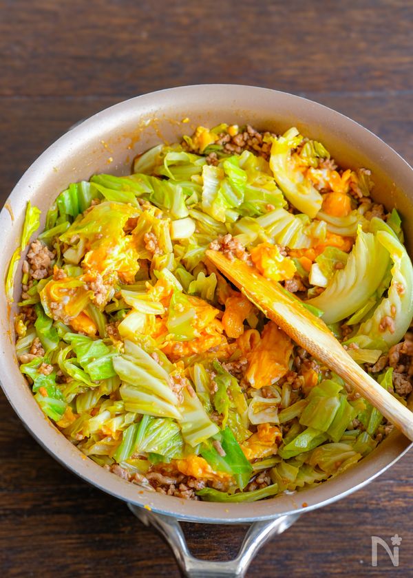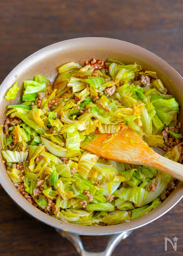 (5) 豚ひき肉に火が通って来たら、きゃべつを加えて炒める。