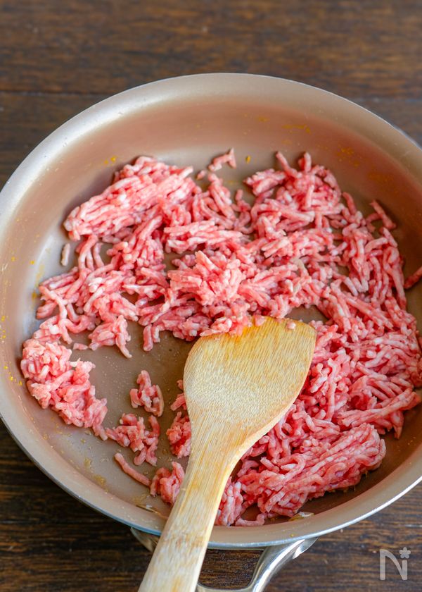(4) 同じフライパンにごま油を足し、豚ひき肉を炒める。