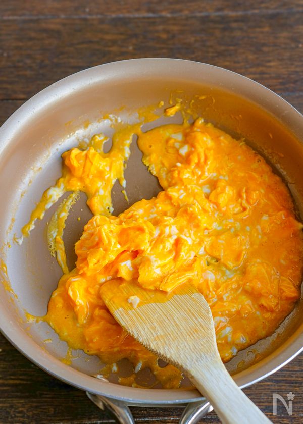 (7) 4に1の卵を戻し入れ、サッと和えたら出来上がり!!