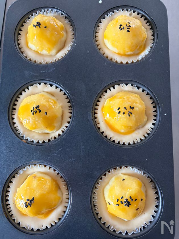 (6) 照りを出すためにハケで卵黄を塗り、黒いりごまを真ん中にのせる。