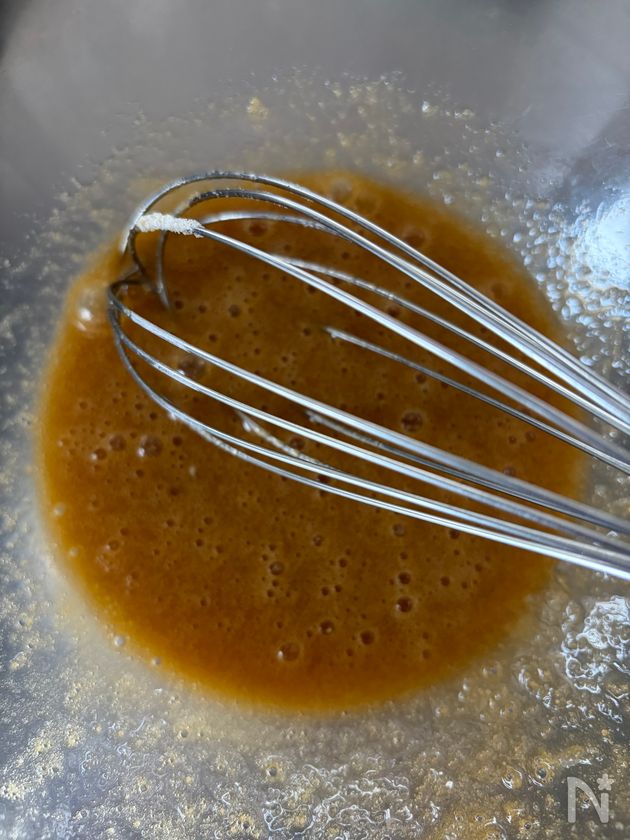 (1) ボウルに卵を入れてほぐし、きび砂糖を加えて泡立て器ですり混ぜる。