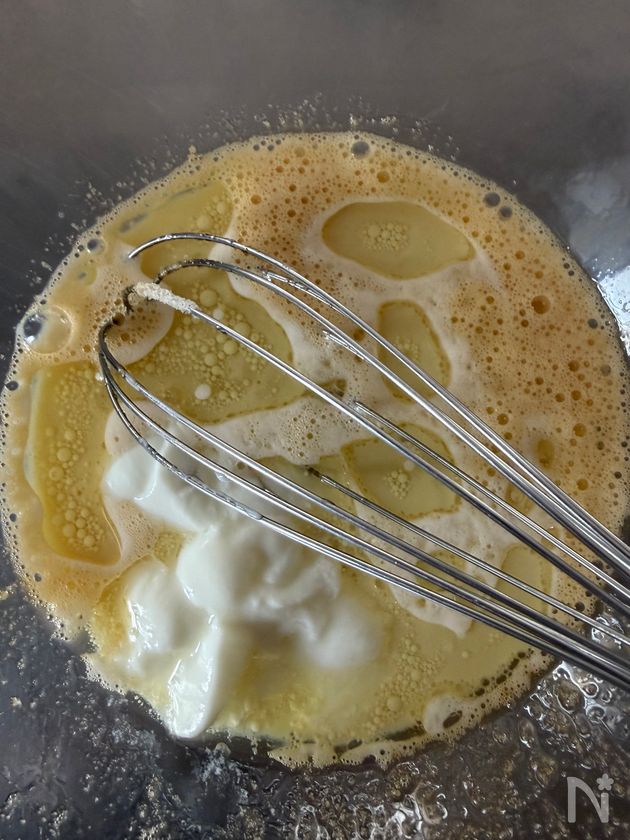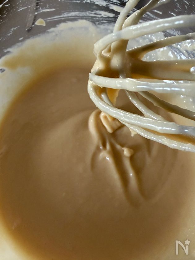 (3) 【C】を加えて、泡立て器のまま粉気がなくなるまでしっかり混ぜる。もったり流れる生地。