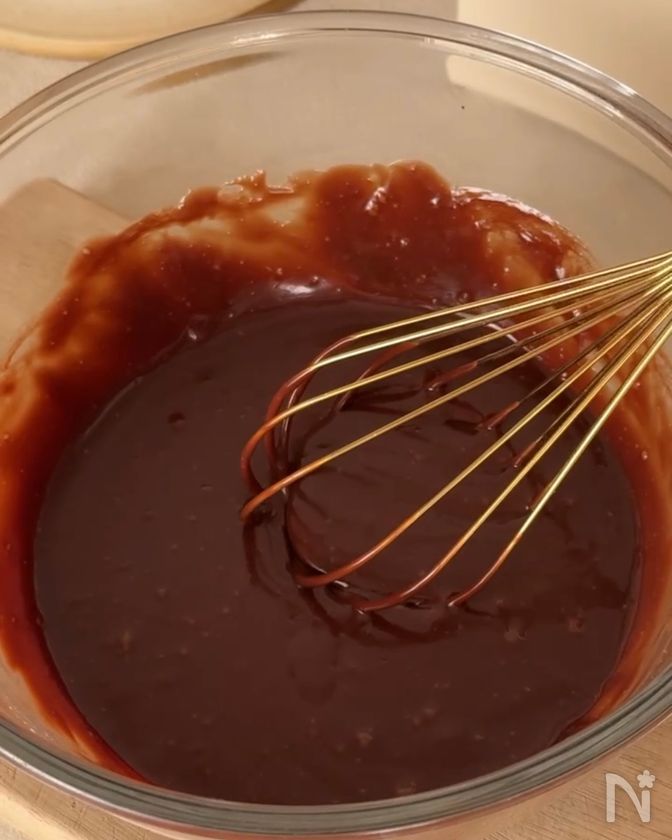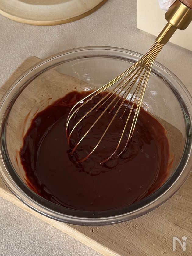 耐熱ボウルに無塩バターと手で割ったブラックチョコを入れてレンジ(600w)1分20秒加熱して混ぜる