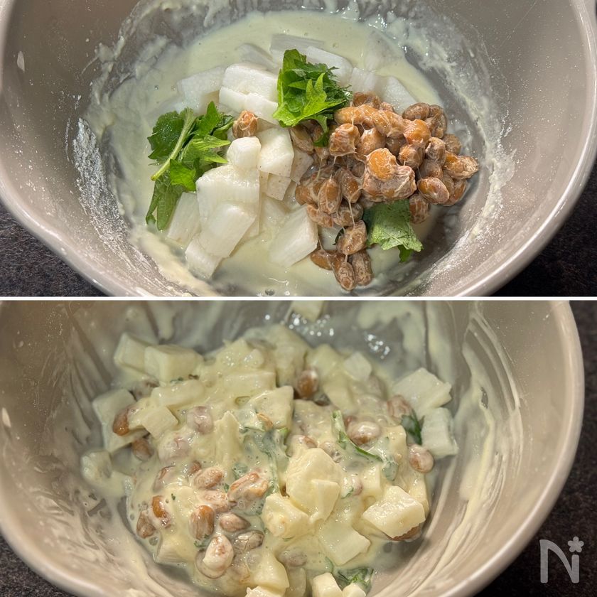 (1) ボウルに【A】を入れてさっくりと混ぜ、衣を作る。納豆、長芋を入れ、大葉をちぎって加え、全体をやさしく混ぜ合わせる。