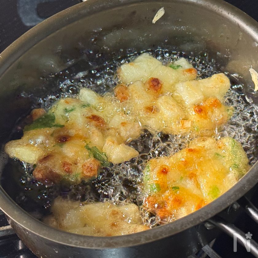 (2) 1をおたまなどでひと口大ずつすくい、170℃の揚げ油にそっと落とし入れる。表面が固まってきたら返しながら、約3分揚げる。きつね色になったら取り出して油を切る。