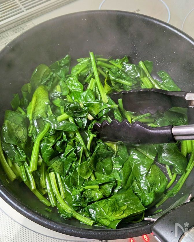・ほうれん草は先に炒めて取り出すことで、味がきれいに仕上がります。最後にフライパンに戻すことで、加熱し過ぎてくたっとするのを防ぎます。