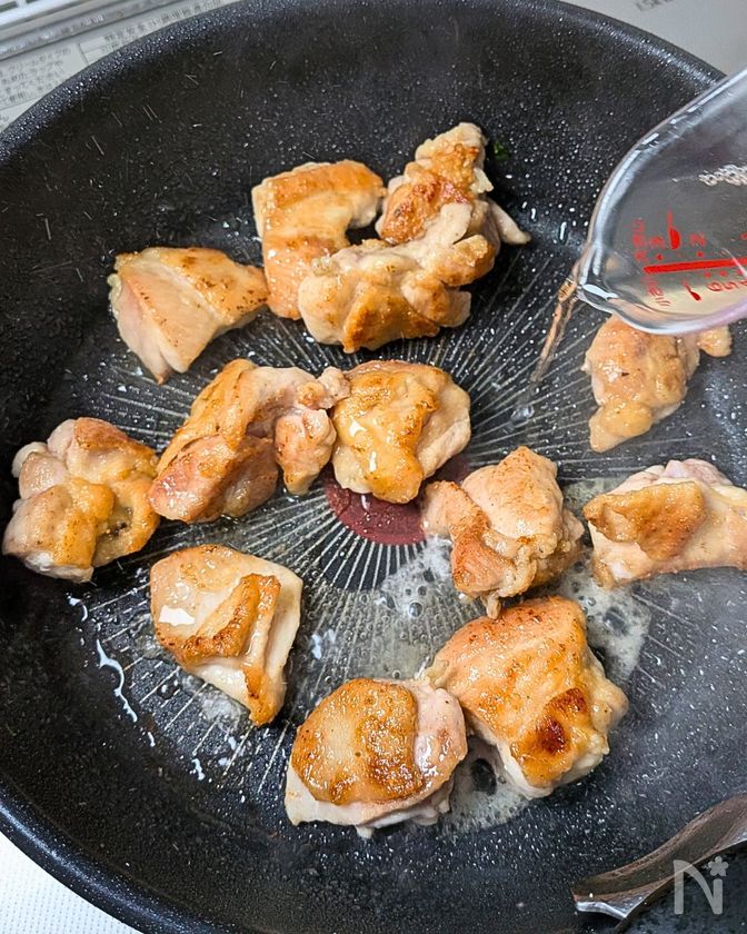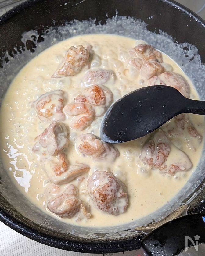 ・鶏もも肉に小麦粉をまぶすことで、ソースにほどよいとろみがつき、具材によく絡みます。