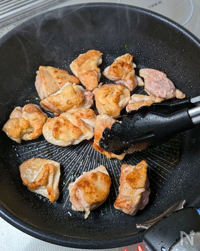 フライパンに残りのオリーブオイル(小さじ2)を足し、鶏もも肉を皮目を下にして入れ中火で2分焼き、上下を返して皿に2分焼く。
