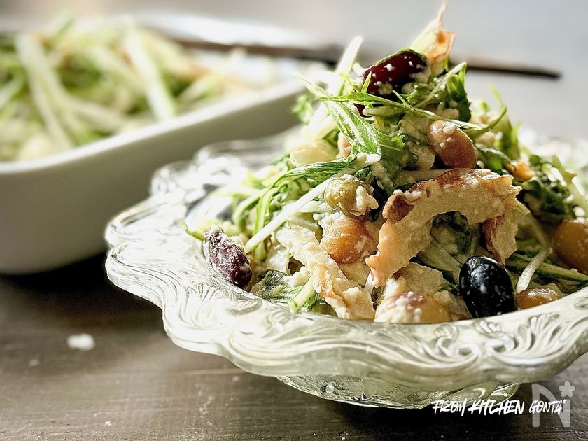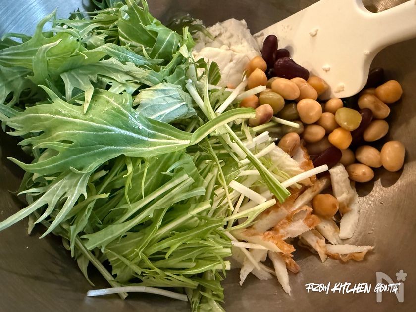 (2) 【A】のボウルに、カットした水菜、ちくわ、水気を切った豆腐、フジッコ 蒸しサラダ豆を加えて、和える。