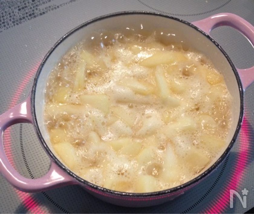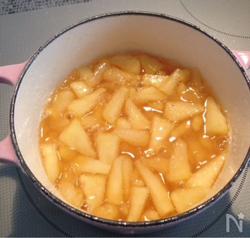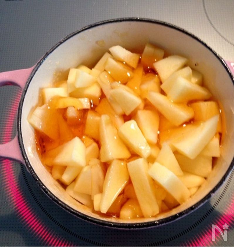 (1) りんご2個分をさいの目に切ったら鍋に入れて、レモン汁とはちみつ大さじ5~を入れる。