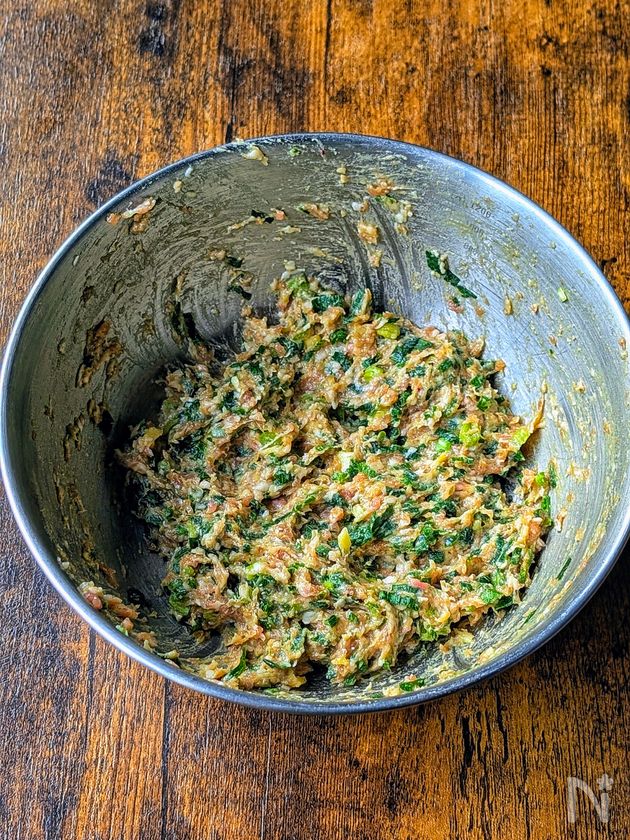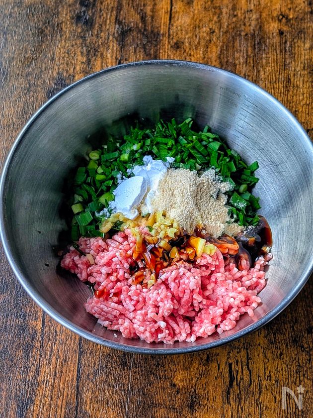 (1) ボウルに豚ひき肉、にら(みじん切り)、しょうが(みじん切り)、【A】を入れる。