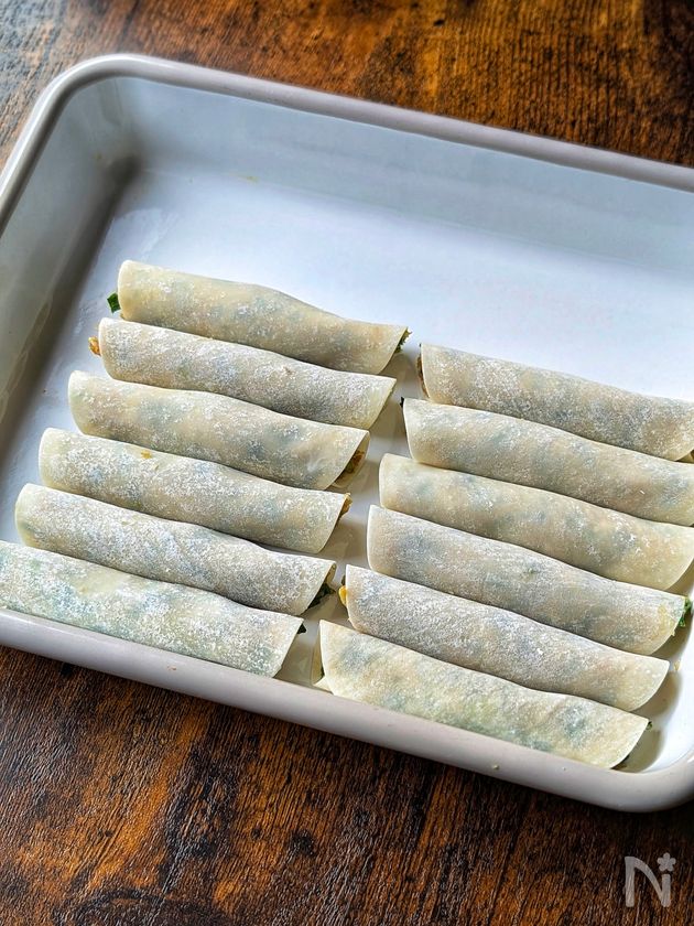 (3) 餃子の皮を広げ、①を平らにのせる。皮の上部を2cm程残し手前からくるくると巻く。