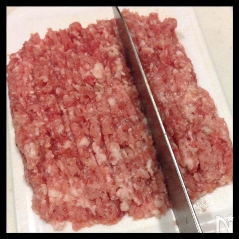 (1) 豚こまを包丁で叩き切り、粗めのミンチ状にする。