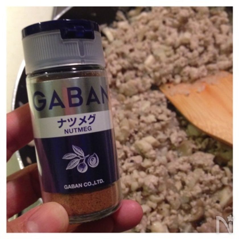 (3) フライパンにオリーブオイルを入れて熱したらミンチ状にした豚こま、人参、玉ねぎを入れて炒め、塩コショウとナツメグを振りしんなりするまで炒める。