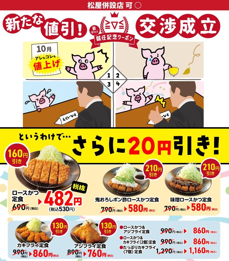 2025年10月30日現在、「松のや」の公式Xでは、ロースかつ定食やカキフライ定食など8メニューが最大210円引きになるクーポンを公開しています。