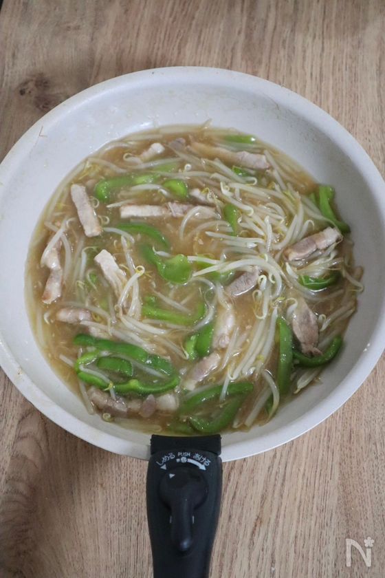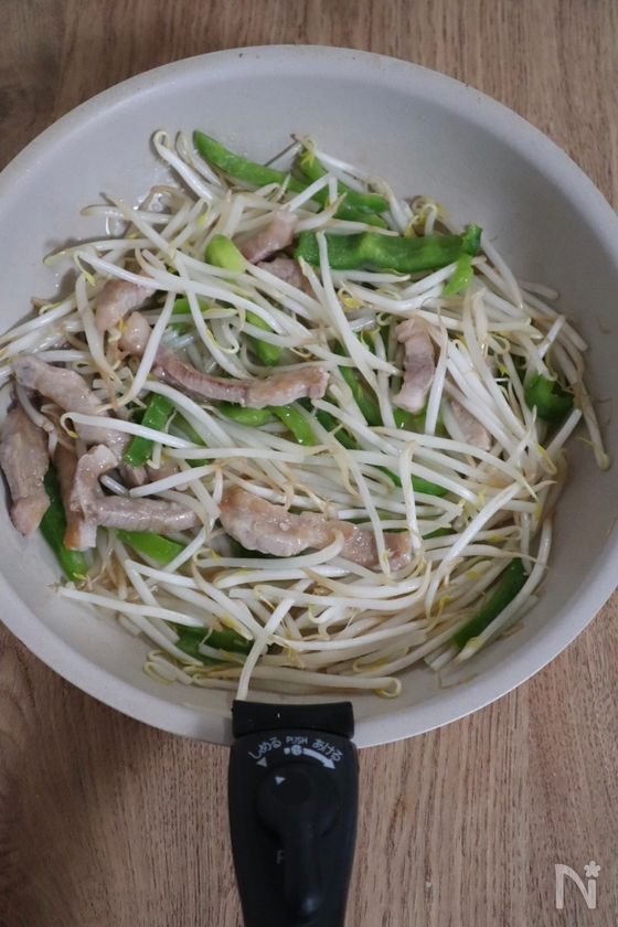(2) もやしと千切りピーマン(冷凍のまま)を入れ、もやしがしんなりし、千切りピーマンが解凍され水分がしっかり飛ぶまで炒める。