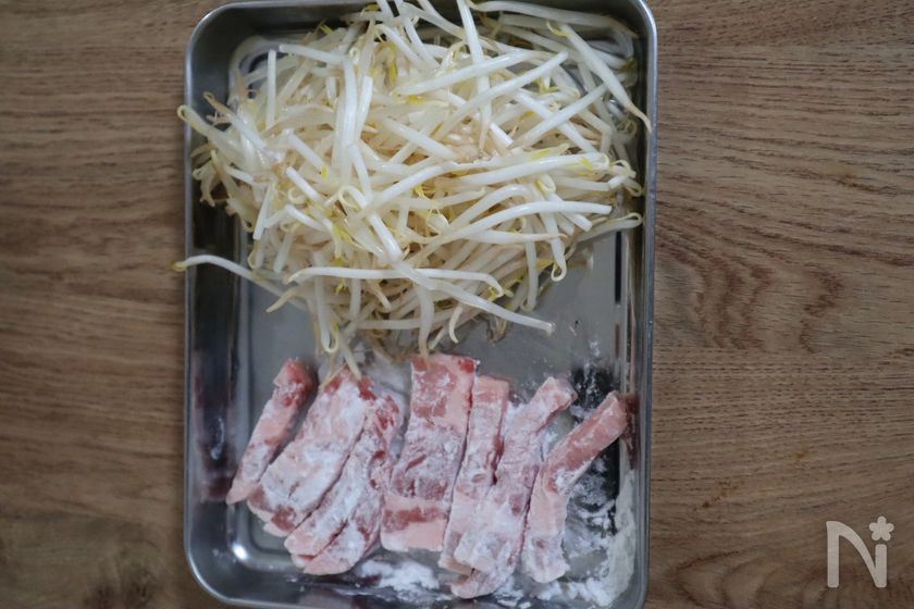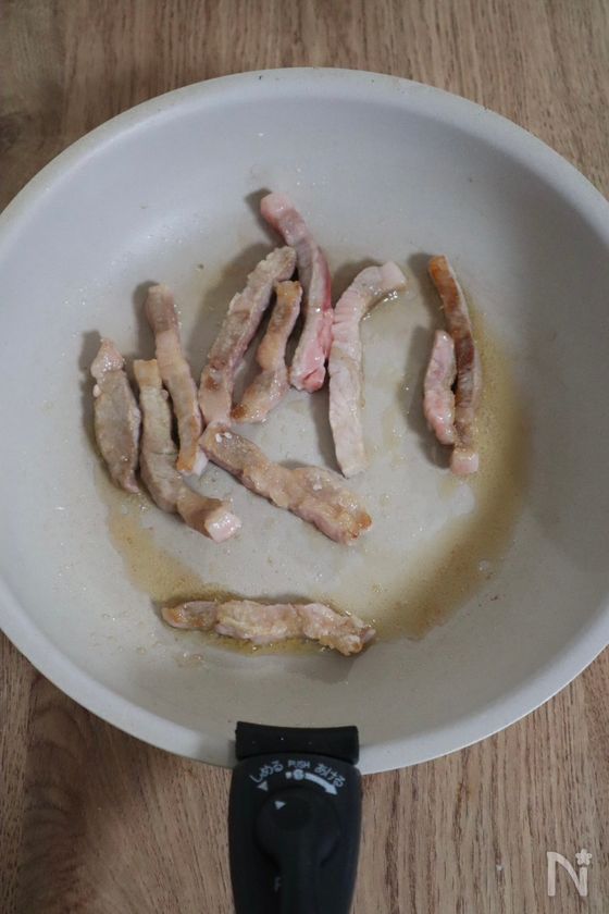 ・豚ロース(厚切り)は細切りにして薄力粉をまぶす。