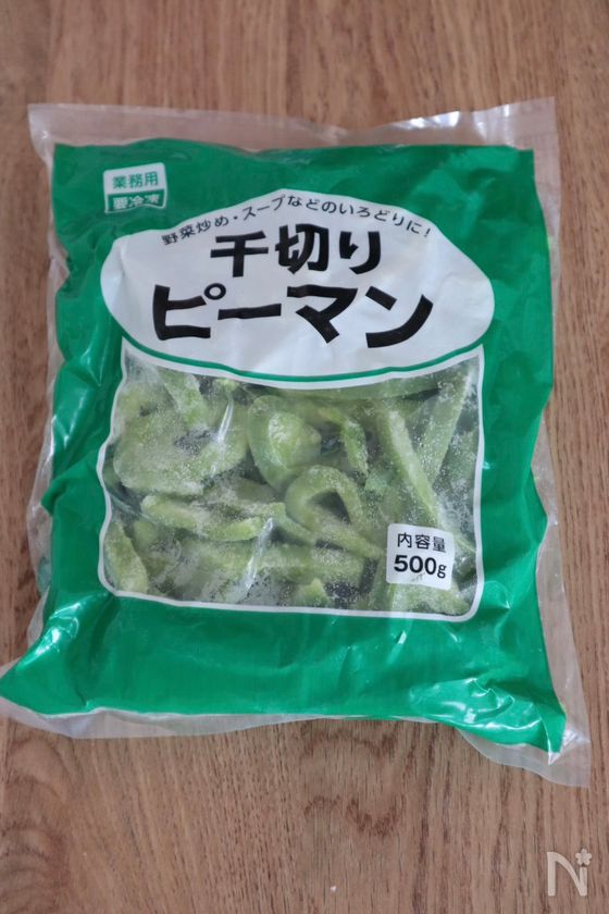 (4) 業務スーパの千切りピーマンを使用しました。ピーマンを軽く湯通しして千切りにし、急速冷凍した商品。必要な分だけ取り出して使えるため、無駄が出にくいのが嬉しいポイントです。冷凍とは思えないシャキッとした食感で、炒め物や麺類の彩りにも便利です。