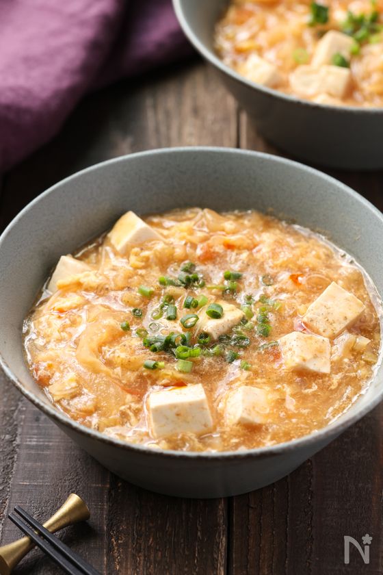 (3) 【A】を加え煮立ったら、混ぜ合わせた【B】を加えとろみがつくまで煮絡め、塩こしょうで味を整える。