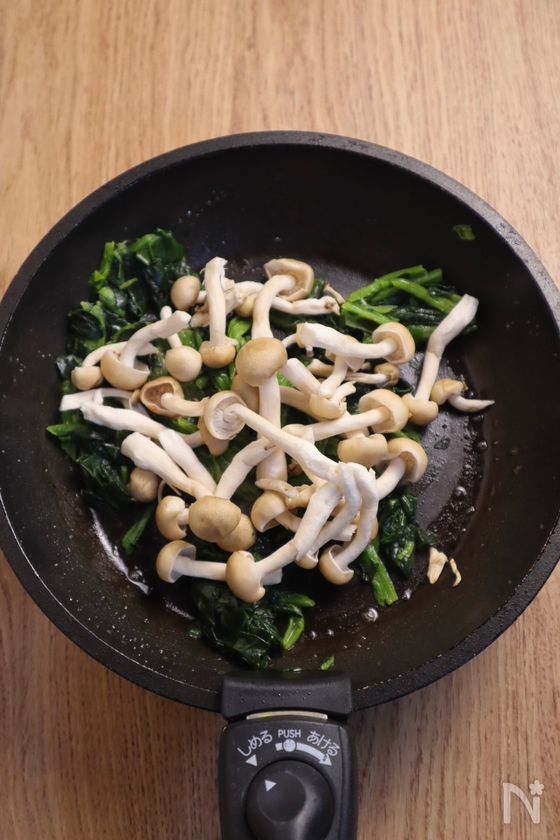 (2) しめじを加え、しんなりするまで加熱。
