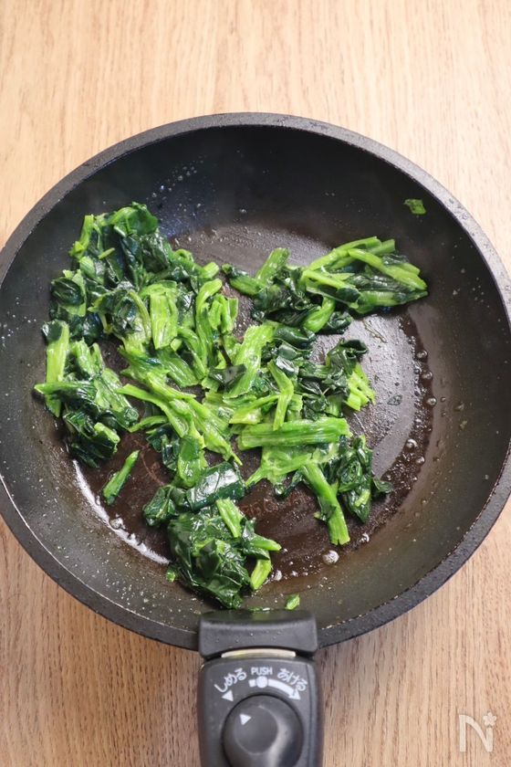 (1) フライパンにバターを溶かし、冷凍のままカットほうれん草を入れ、中火で解凍するように炒める。