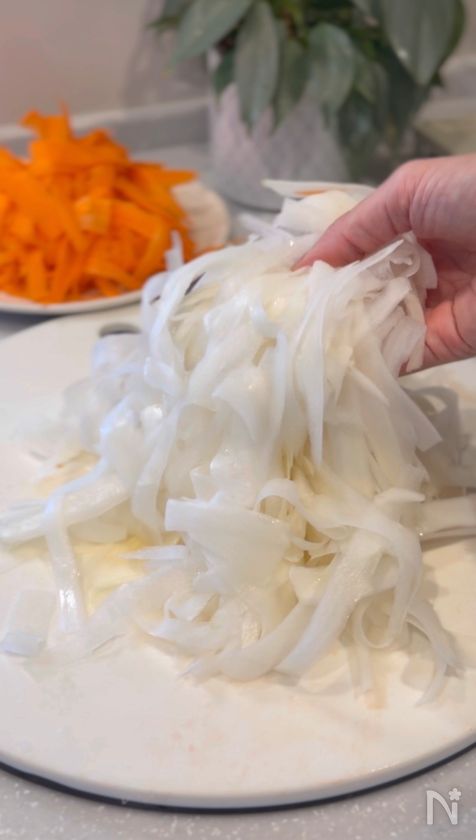(1) 大根と人参はピーラーでひらひらにする。